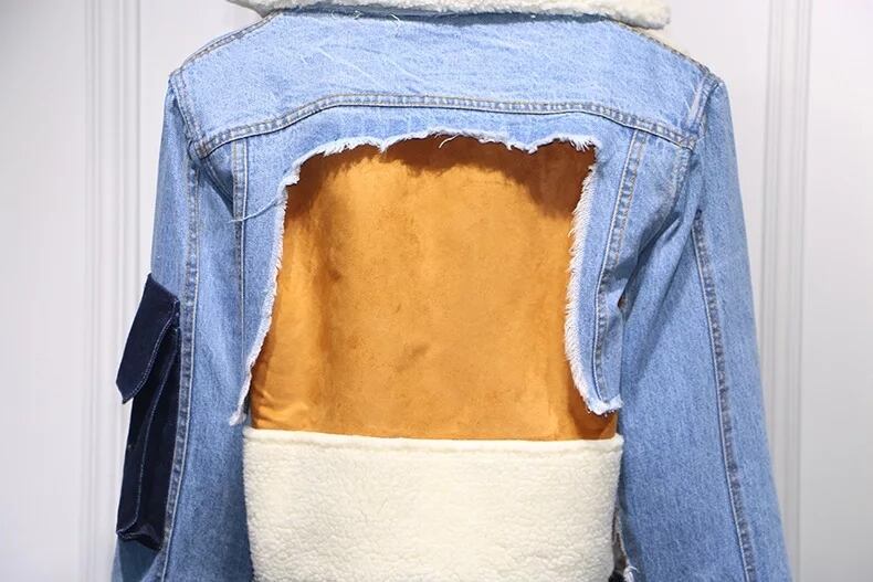 DEAT 2019 冬の羊の毛皮ターンダウン襟フル袖デニムブルーパッチワークの服の手紙プリントコートトレンチ WJ1020