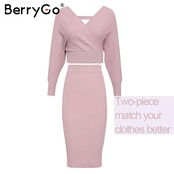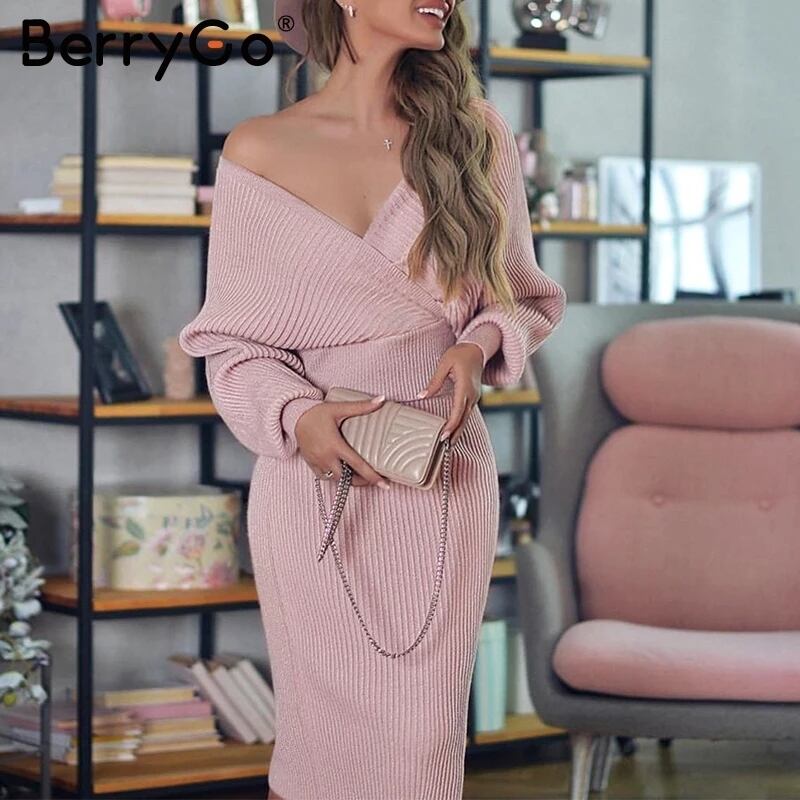 BerryGo セクシーな v ネックニットドレス女性ツーピースバットウィングスリーブ女性のセータードレス、エレガントな純粋なレディースボディコンミディ vestidos