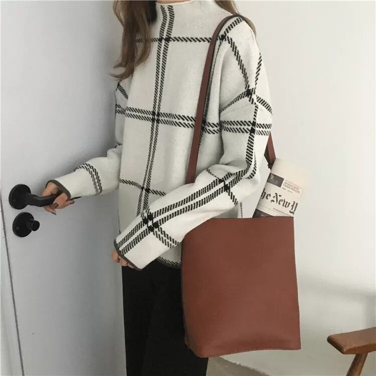 2019 イン冬の新女性のプルオーバーセーターのファッションチェック柄タートルネックルーズニットフル袖 T98301D トップス