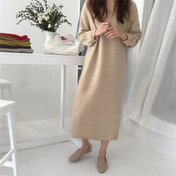 REALEFT 2019 新秋冬の女性のカジュアルニットロングドレス長袖 V ネックニット
