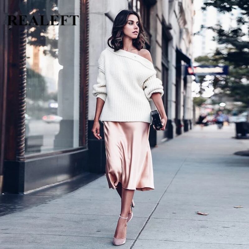REALEFT 2019 新到着の女性のファッションシルクサテン A ラインエレガントなスカートシンプルなソフト女性ミディスカート女性のための韓国スタイル