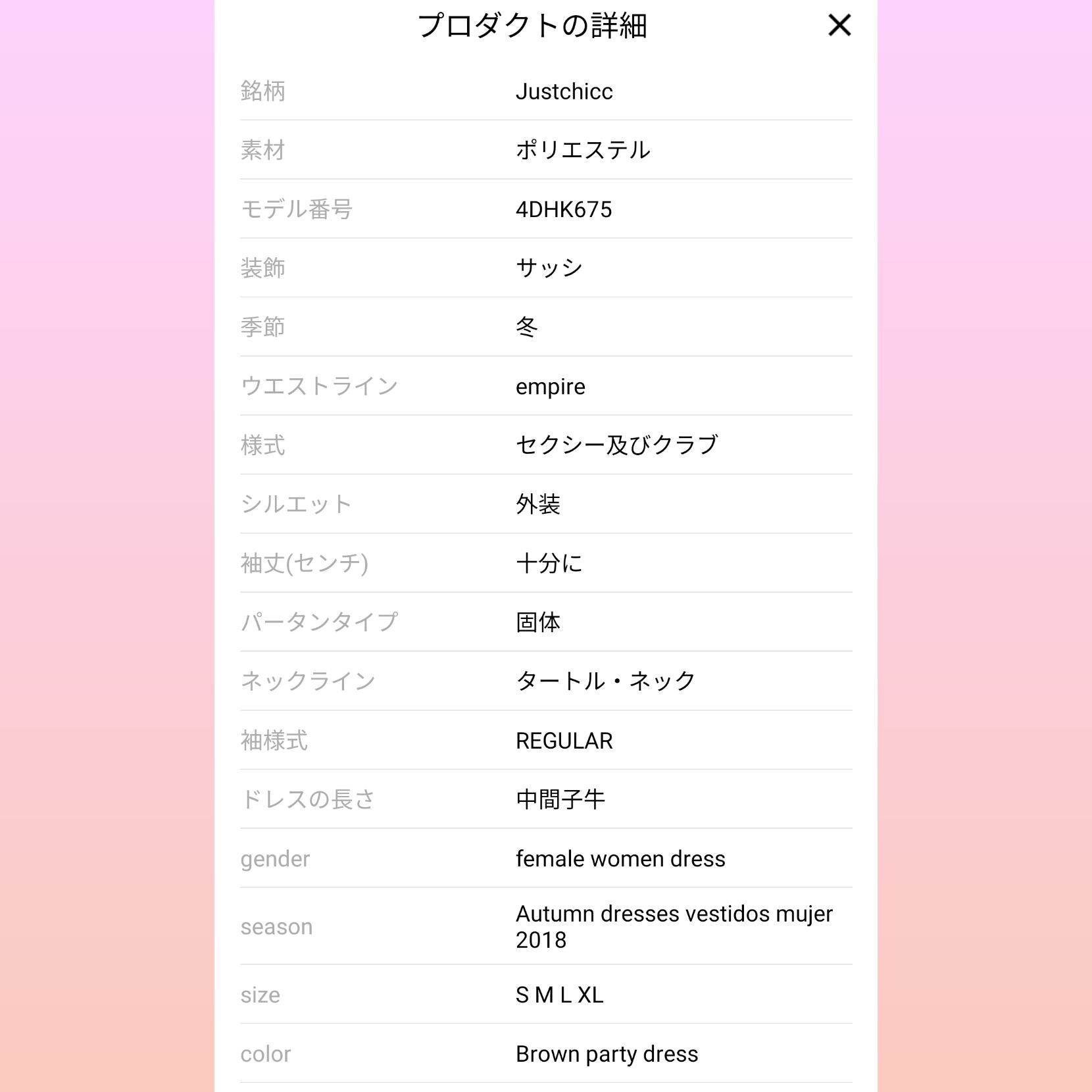 L→胸幅(㎝)/92-96,ウエスト(㎝)/72-76,ヒップ(㎝)/94-98