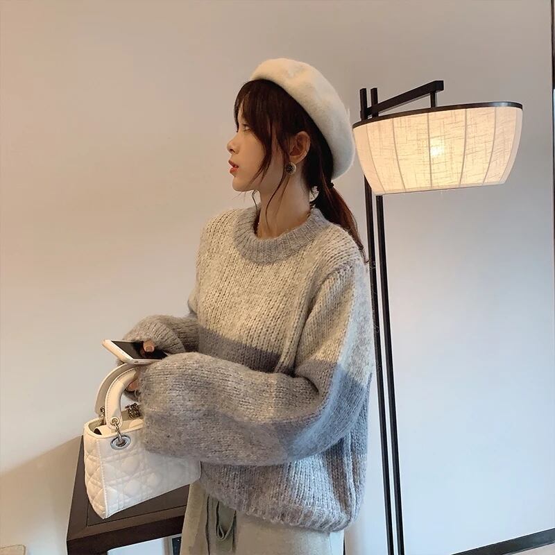 Mishow ストライプ厚手のニットセーターラウンドネックルーズロングスリーブニットプルオーバー