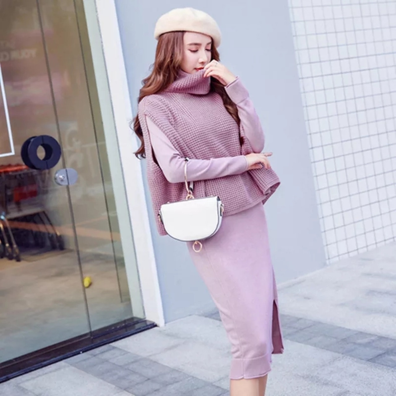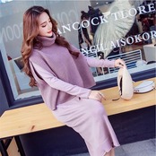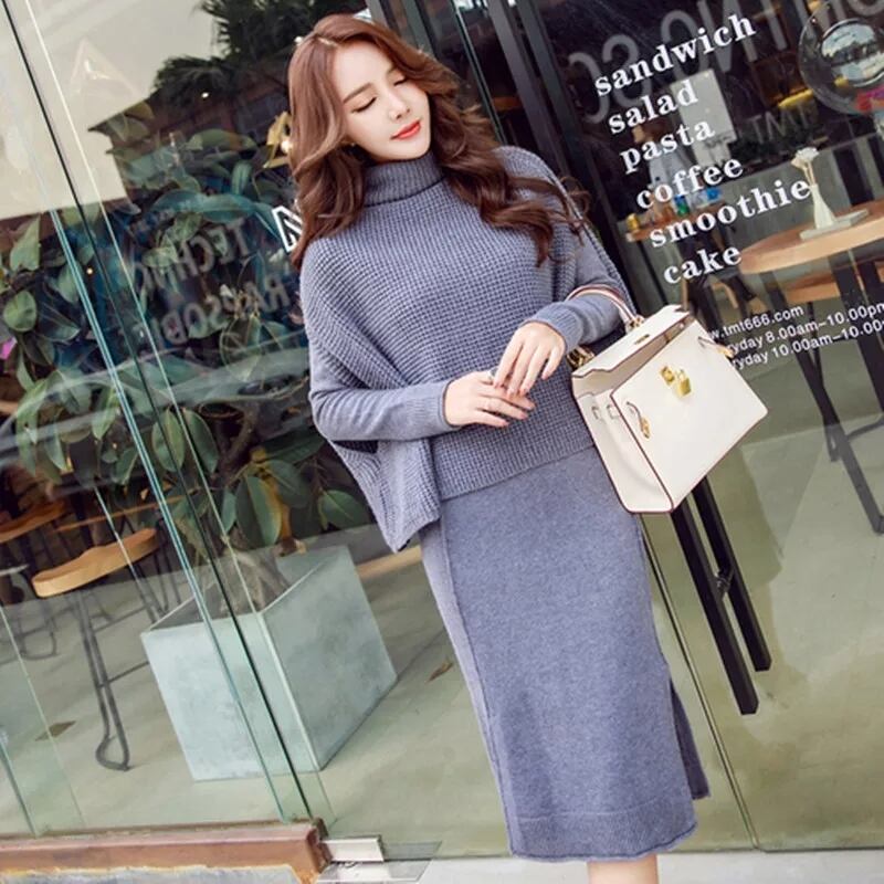 タートルネックプルオーバー + ウール長袖サイドスプリットスカート 2 点セットニットスーツ